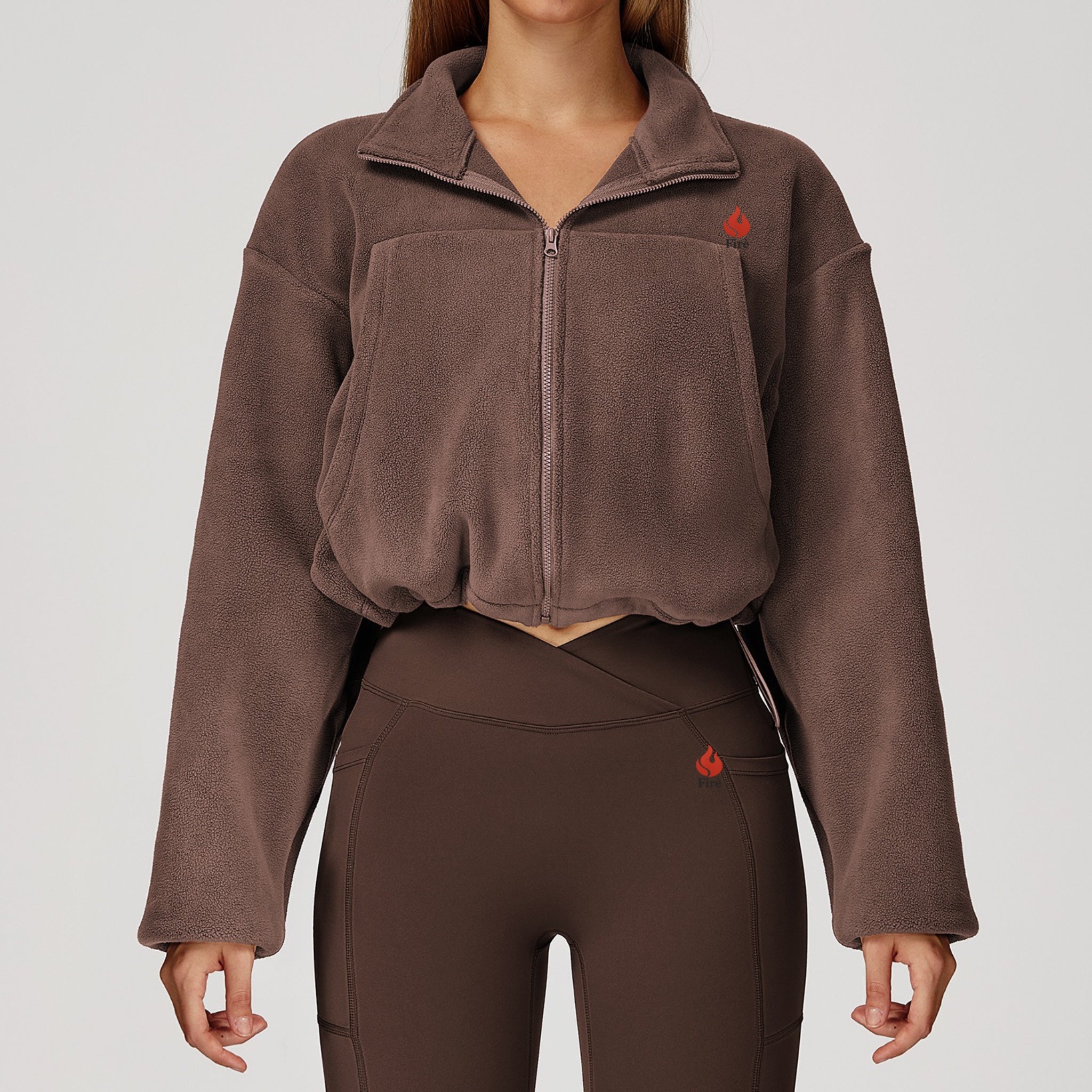 xThis cropped fleece zip-up jacket offers a relaxed, cozy fit with a soft plush texture perfect for lounging or layering. It features a front zipper closure, long sleeves, and an adjustable gathered hem for a flattering silhouette. Drawstrings at the waist. Designed with comfort and versatility in mind, it pairs effortlessly with leggings or casual bottoms for an elevated look.